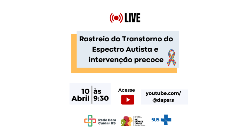No dia 10 de abril, às 9h30, será realizada a live com o tema “Rastreio do Transtorno do Espectro Autista e intervenção precoce”, transmitida ao vivo pelo canal da DAPS/RS no YouTube (https://www.youtube.com/watch?v=gynaJbqQD54).